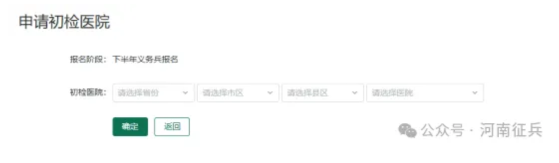 义务兵报名信息填写完毕并成功提交后,请在当地乡镇武装部或高校征兵工作站工作人员的指导下,点击我的进度里的“初检初核”按钮,选择初检医院进行初检,这是参军环节的第一步。